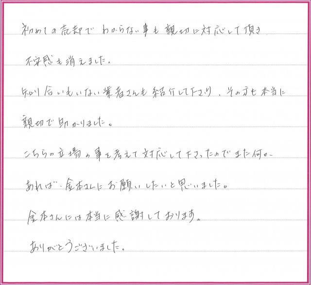 こちらの立場の事を考えて対応して下さったので、また何かあれば金本さんにお願いしたいと思いました。