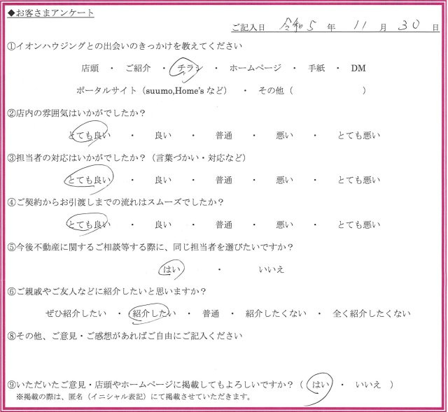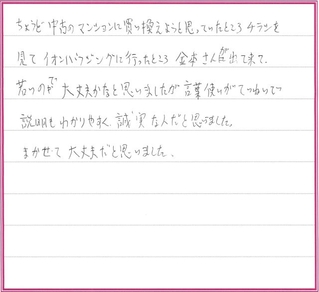 - ちょうど中古のマンションに買い換えようと思っていたところ、チラシを見てイオンハウジングに行ったところ、金本さんが出て来て、若いので大丈夫かなと思いましたが、言葉遣いがていねいで、説明もわかりやすく、誠実な人だと思いました。