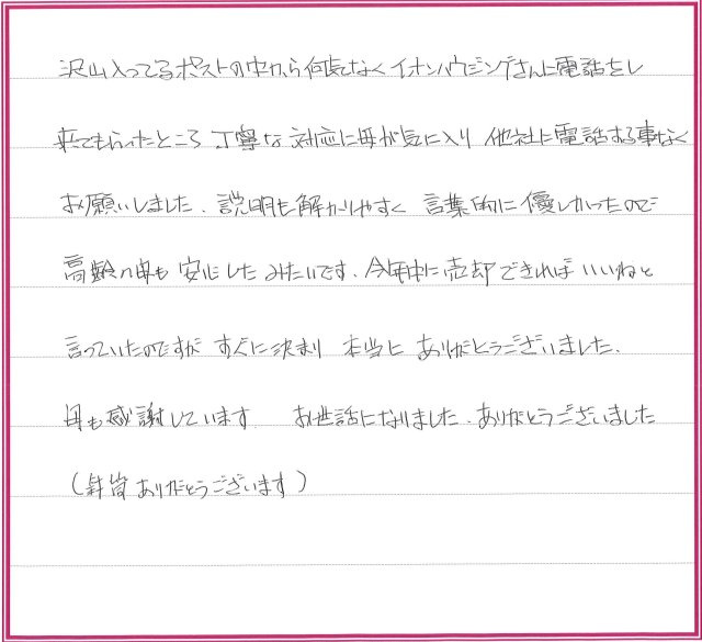 今年中に売却できればいいねと言っていたのですが、すぐに決まり、本当にありがとうございました。母も感謝しております。