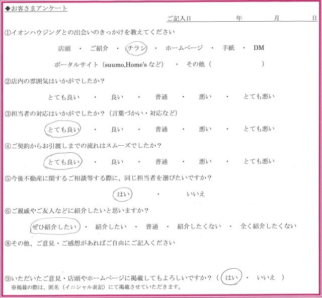 - 沢山入ってるポストの中から何気なくイオンハウジングさんに電話をし、来てもらったところ、丁寧な対応に母が気に入り、他社に電話することなくお願いしました。